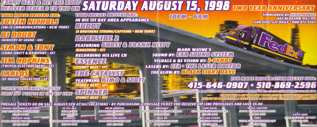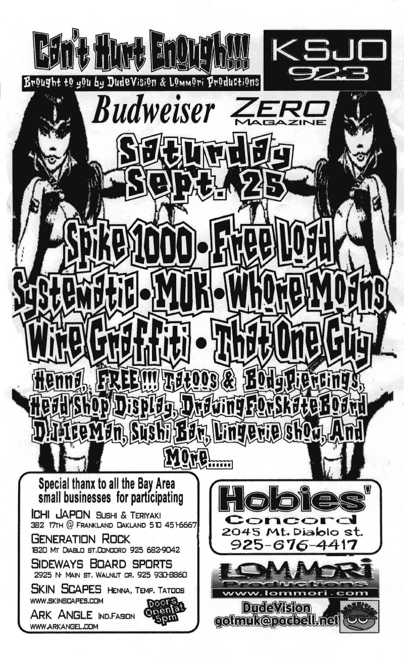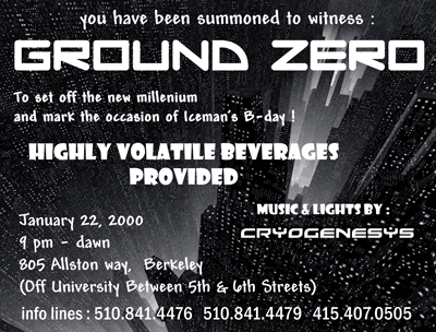 UPCOMING SHOWSAt this time I am semi-retired, I would like to get back into it, but current non-musical projects have kept me busy.PAST SHOWS07.13.01 - DEFCON 9.0 Las Vegas NV, 05.19.01 - Annilation 2001 ! SF, CA. 11.18.00 - Edinburgh Castle, 950 Geary San Francisco, CA 10.28.00 - "Can't Hurt Enough #3, at Hobie's Roadhouse, 2045 Mt. Diablo St., Concord CA 09.28.00 - CD release Party for Wire Graffiti's second album, "HITTING TRAFFIC" 07.30.00 - DEFCON , in Las Vegas ( Pictures HERE ) 06.17.00 - "Can't Hurt Enough" #2, at Hobie's Roadhouse, 2045 Mt. Diablo St., Concord CA. 01.22.00 - "Ground Zero" in Berkeley,CA. 12.31.99 - New Years Eve Party with Catalyst, DJ Dubrock, and Harry Who. 12.11.99 - "Unnecessary Procedure" in Berkeley,CA. 09.25.99 - "Can't Hurt Enough" With KSJO, Lommori Productions, Dudevision Graphics. 06.18.99 -Backup for The CataLyst for their performance at Live 105's BFD at the Shoreline Ampitheater -with Red Hot Chili Peppers, Blink 182, Limp Bizkit, Kid Rock, Sugar Ray, Cake, Smash Mouth, Lit, Moby, Pennywise, Orgy, Silverchair, Lo Fidelity All-stars, The Living End, Imperial Teen, Stunt Monkey, Swingin' Utters, Diesel Boy, Dealership, and Skip Holiday. 12.31.98 Backup for The CataLyst at Origin Rave in Oakland 08.15.98 Backup for The CataLyst at Fedex2 Rave in Oakland CA. - video made at the event - "downtown" (The video says "San Francisco", but was really filmed in Oakland.) 09.13.97 - Chill room DJ - "Electric Highway Tour" Pier 45, San Francisco (as "Iceman" ) With Crystal Method, Fluke, Arkana, DJ Dan, Jeno, DJ Icey, Doc Martin, DJ Sneak, Skylab Soundsystem, DJ Rap, Alfred More, phunck-a-teck - (I got to meet Crystal method back stage - very cool!) 1997 - Various events as resident DJ for Mixman Technologies. |